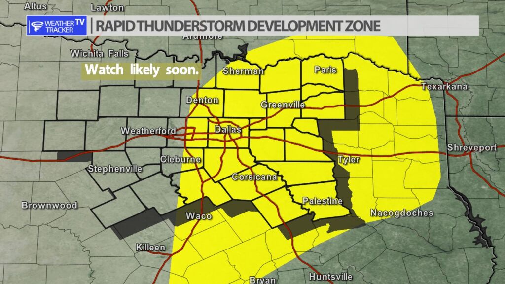 From William Cole: A T-Storm Watch has been issued in the Weather Tracker TV DFW coverage area for the following counties until 10:00 PM Monday. Anderson, Collin, Dallas, Delta, Ellis, Fannin, Freestone, Henderson, Hill, Hopkins, Hunt, Kaufman, Lamar, Navarro, Rains, Rockwall & Van Zandt.