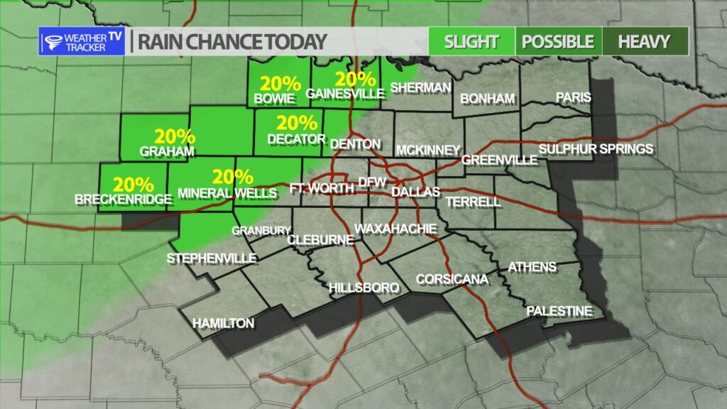 It will be warm, windy and humid across North Texas today. In our far northwestern counties there is a slight chance of a late day thunderstorm – if a storm were to form in that area – it could be severe with hail up to the size of golf balls and wind gusts up to 65 mph. The latest data continues to show most if not all of the activity stays up in Oklahoma. As always, we’ll be watching it and have updates on the app and channel as needed.