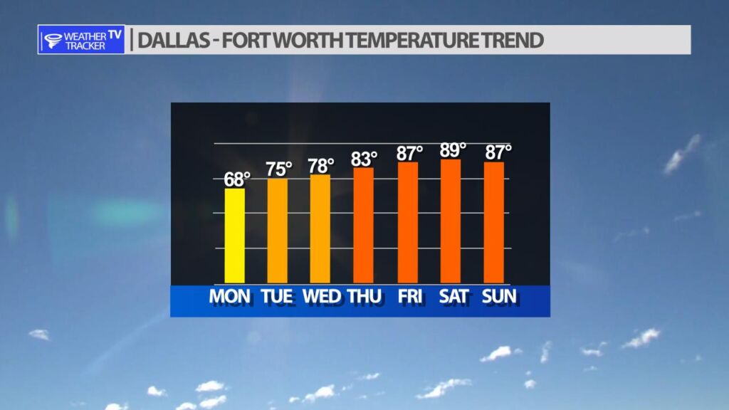 The temperature trend this week will be up across North Texas. Today will be the coolest day with highs in the 60’s. Tuesday and Wednesday look beautiful with highs in the 70’s and dry (less humid) air. The Gulf of Mexico moisture returns with warmer temperatures to close out your work week.