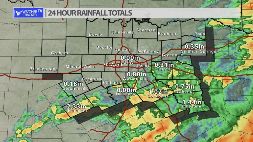 While most of North Texas missed out on rainfall yesterday – our southern counties did not. A strong cold front moving through the area was the trigger for late day rain and storms. The activity was mostly confined to I-20 corridor and locations to the south. This was a very generous rain with locations picking up between 1″ to 2″+. This is also great news for Hamilton and Bosque counties who are currently under exceptional drought criteria.