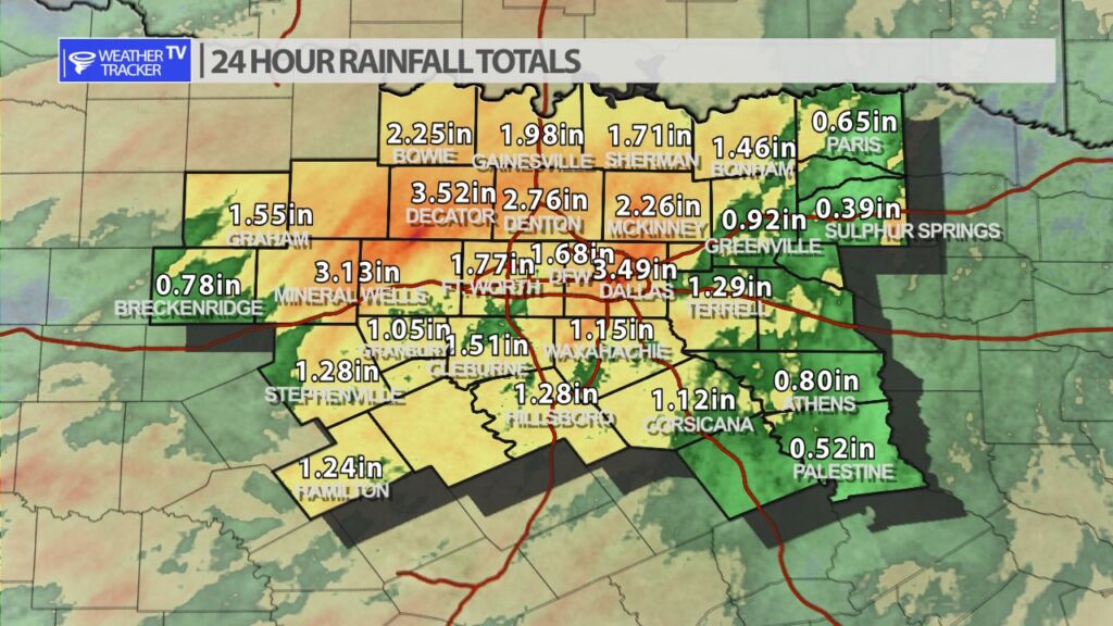 North Texas received a much needed good ol’ fashion soaker over the last 48 hours. Much of the area continues to be afflicted by drought criteria. While this wasn’t a complete drought buster it will help as we begin to transition into our drier months of the summer season. A good swath of North Texas received 1 – 3+ inches of rain.