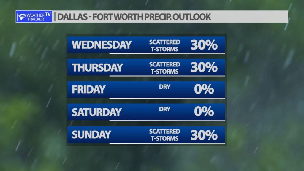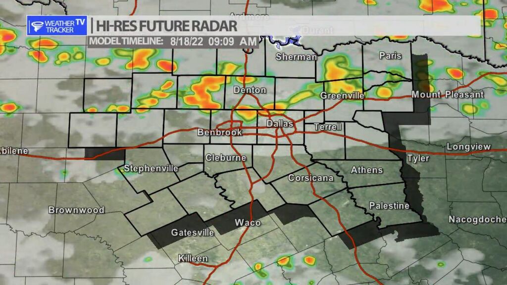 Rain and storm chances return to the forecast in North Texas as a summer cold front pushes into the area today. Late this afternoon rain and storm chances will be best from I-20 to the south. The activity will be scattered and spotty so not everyone will receive rain, but heavy downpours, vivid lightning and gusty wind would be possible. Tomorrow morning one more round of rain and storms moves across the area. Then expect a mostly dry Thursday afternoon with highs in the 80’s. An isolated severe storm or two is possible with wind gusts up to 60 mph, but widespread severe weather is not anticipated.