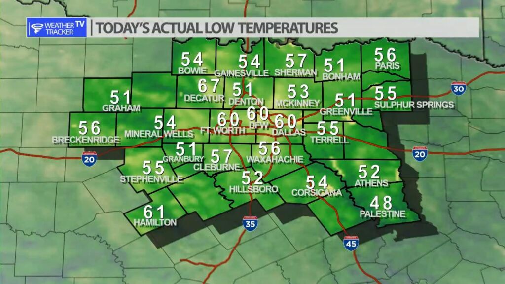 You may of needed a light jacket or a hoody out the door this morning. Actual lows were a mix of 50’s and 60’s across North Texas.