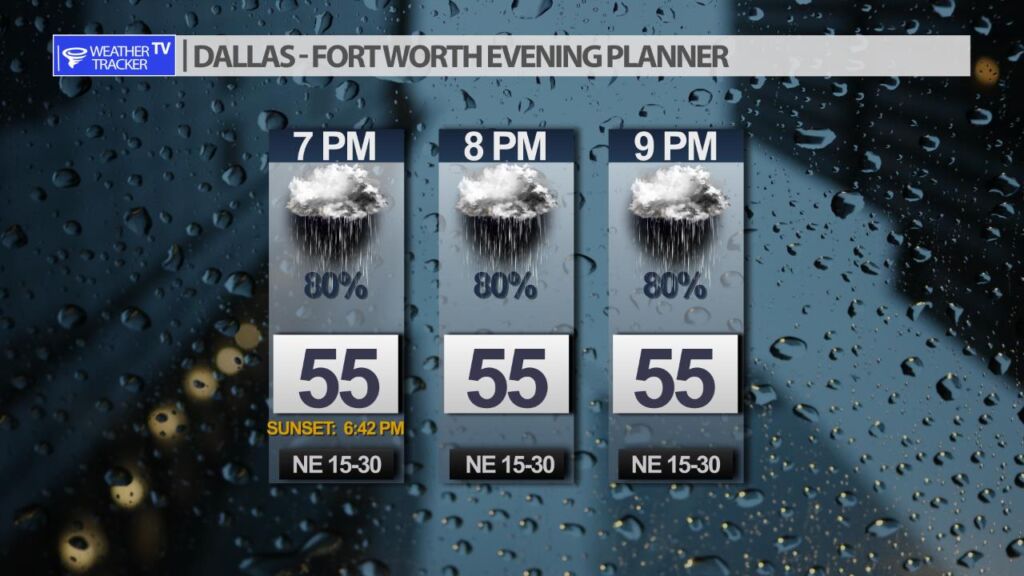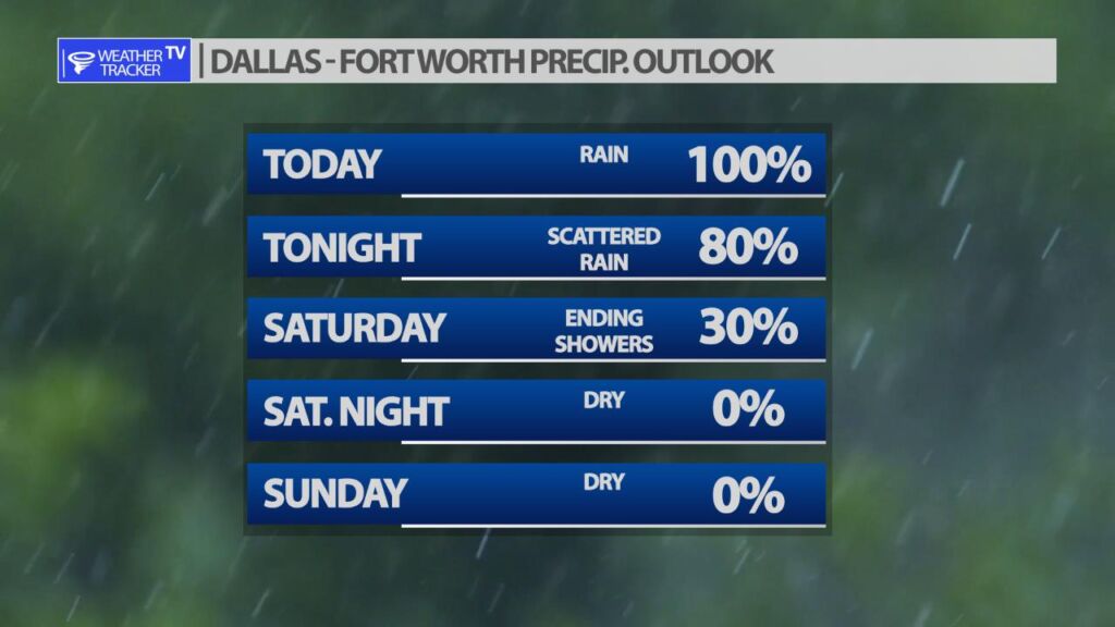 It’s going to be a wet Friday with rain likely through the day. The rain becomes scattered by late afternoon into the evening. If you’re making Friday evening plans or even Friday late night plans – prepare for a wet and chilly forecast. Rainfall remains moderate today so other than ponding on the roadways – the flooding potential is minimal – this is a good ol’ fashion Fall soaker. While there is no risk of severe weather in North Texas today the risk increases in Central Texas down into the Coastal Plains.
