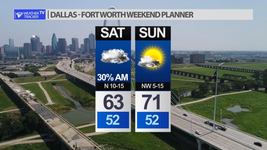 Saturday starts chilly and cloudy with a few lingering showers. Shower chances taper off with clearing skies through the day. Sunday is the pick day of the weekend – mostly sunny with a high near 70.