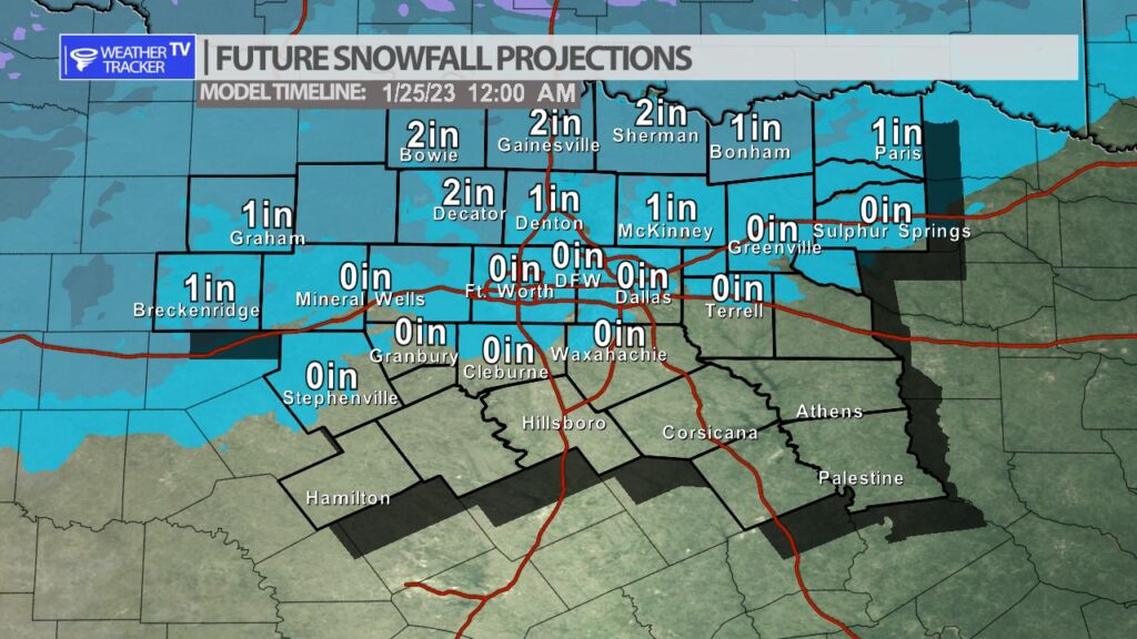 Light snow is expected across portions of North Texas this evening Light accumulations on grass and elevated surfaces are possible, primarily from the Big Country into Texoma. Ground temperatures will be too warm for widespread travel impacts, but some slick spots will be possible on bridges and overpasses.