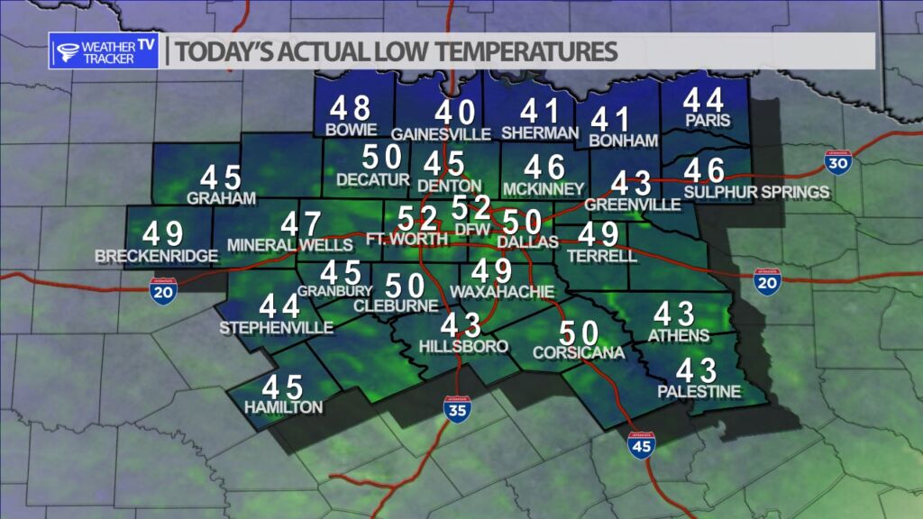 It was a cool start to our Saturday morning with lows across North Texas a mix of 40s an d 50s. Patchy areas of fog were also reported near the Red River.