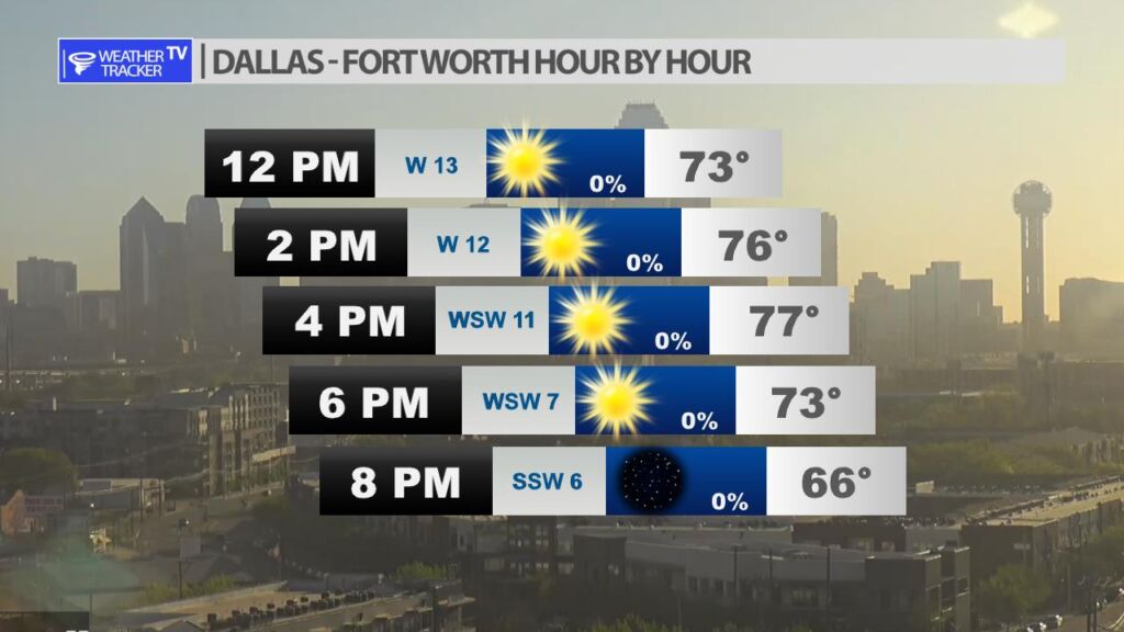 Expect a beautiful Saturday in the DFW Metroplex. Plenty of sunshine with highs in the 70s and a southwest breeze.