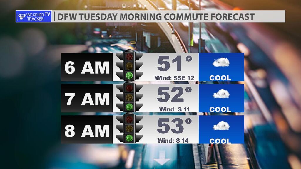 Expect a cool and breezy Tuesday morning commute in the Metroplex. An isolated light shower or drizzle is possible.