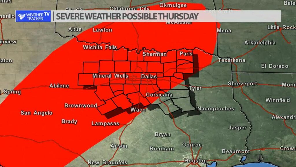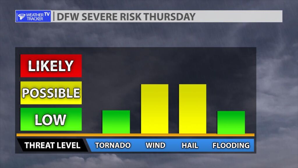 We are still tracking a risk of severe weather on Thursday. As a strong upper level storm system and cold front meet warm and humid air over the southern plains. A dryline will set up out in the Big Country and our western counties. It will be the focus of late afternoon storms. Large hail will be the threat during that time. A cold front will eventually arrive from the north and a broken line of storms will sweep across the area. A damaging wind threat will develop with the line of storms. A tornado warning or two can’t be ruled out.