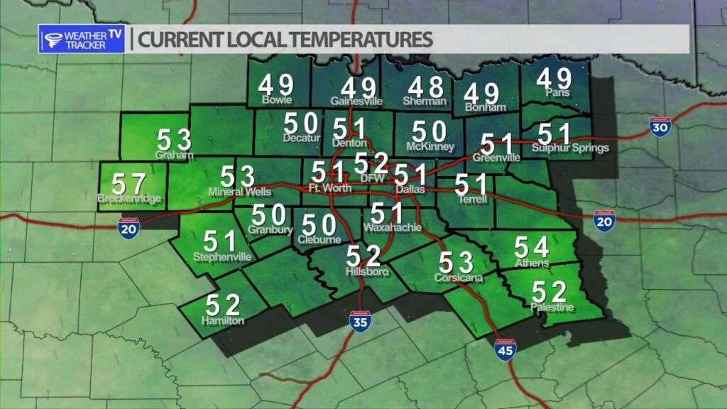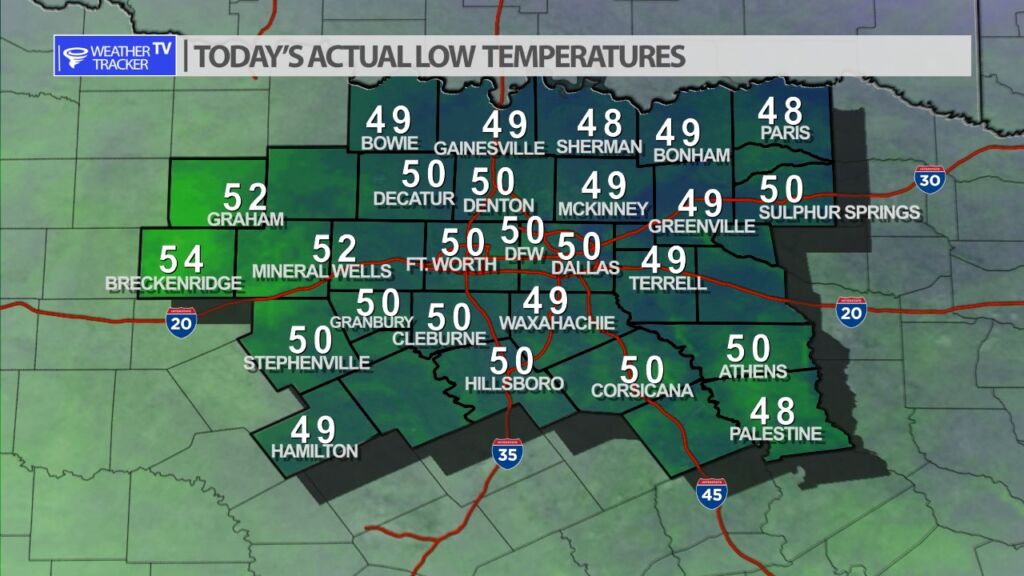 It was chilly but not as cold this morning with actual lows across North Texas right around 50 in most locations.