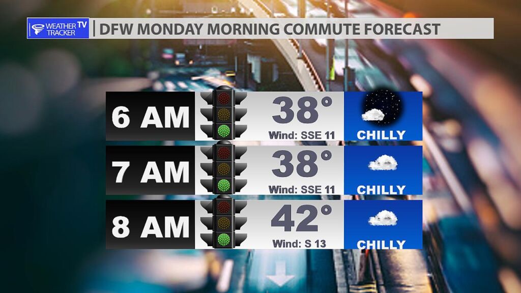 It’s a chilly but dry start to your Monday morning commute. Metroplex temperatures will be in the upper 30’s to lower 40s.