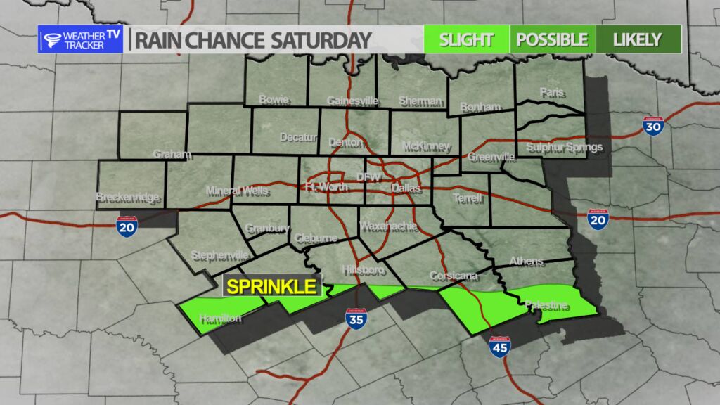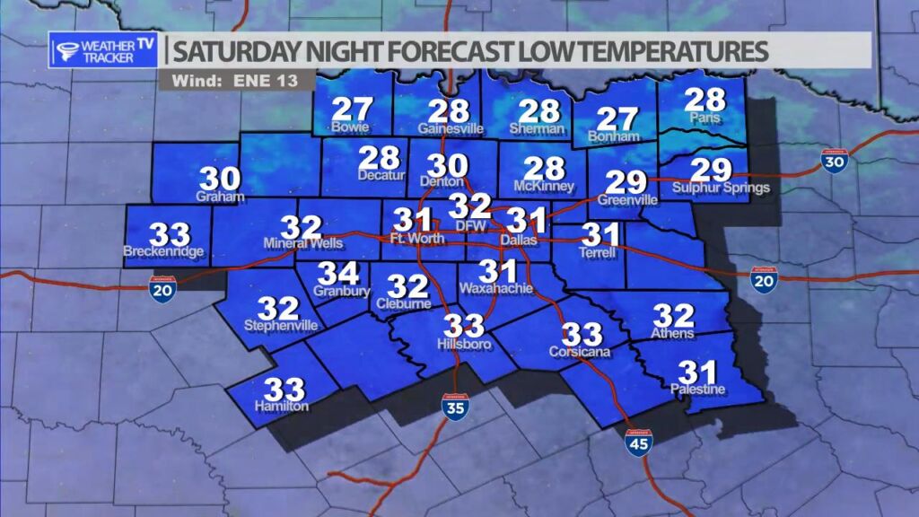 A light freeze will be possible tonight across much of North Texas. Most locations will be flirting with the freezing mark. Temperatures along the Red River Valley will be slightly colder with mostly 20s. A freeze warning is in effect for most of North Texas through 9 AM Sunday.