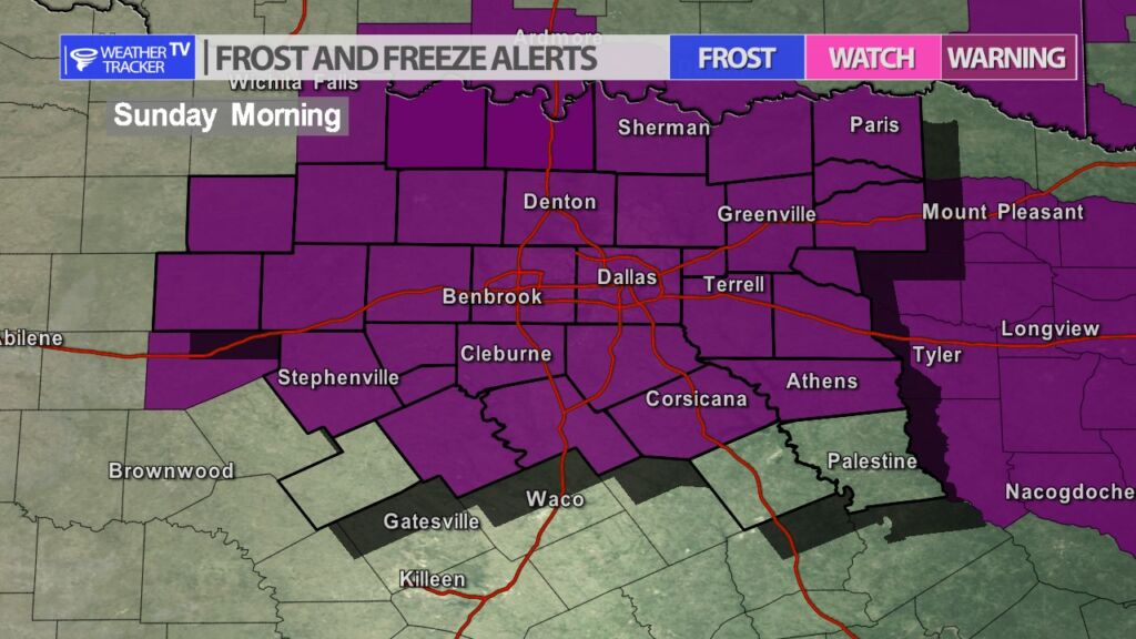 From William Cole: A Freeze Warning has been issued in the Weather Tracker TV DFW coverage area from 3:00 AM Sunday until 9:00 AM Sunday for Anderson, Freestone & Hamilton Counties in North Texas.