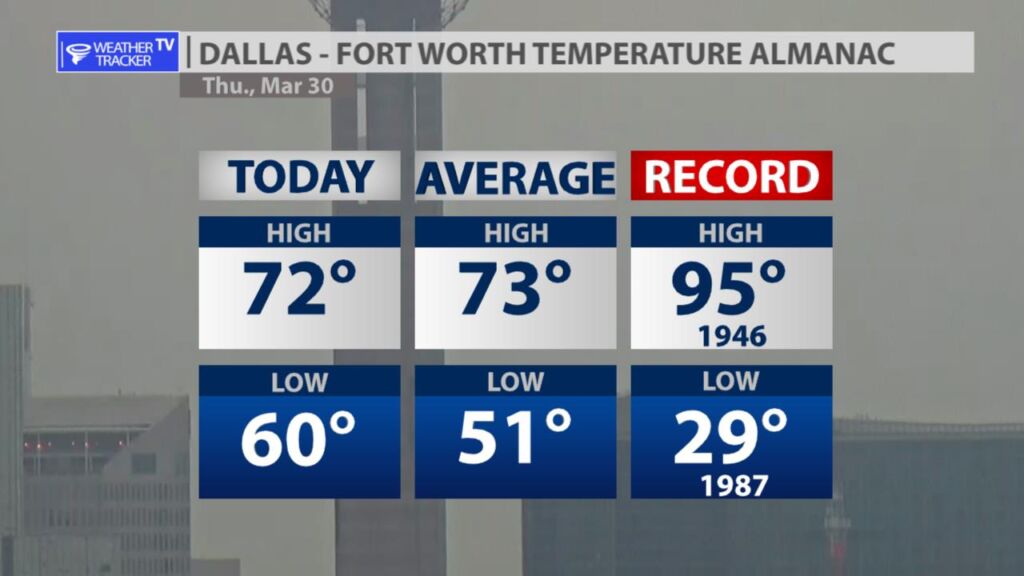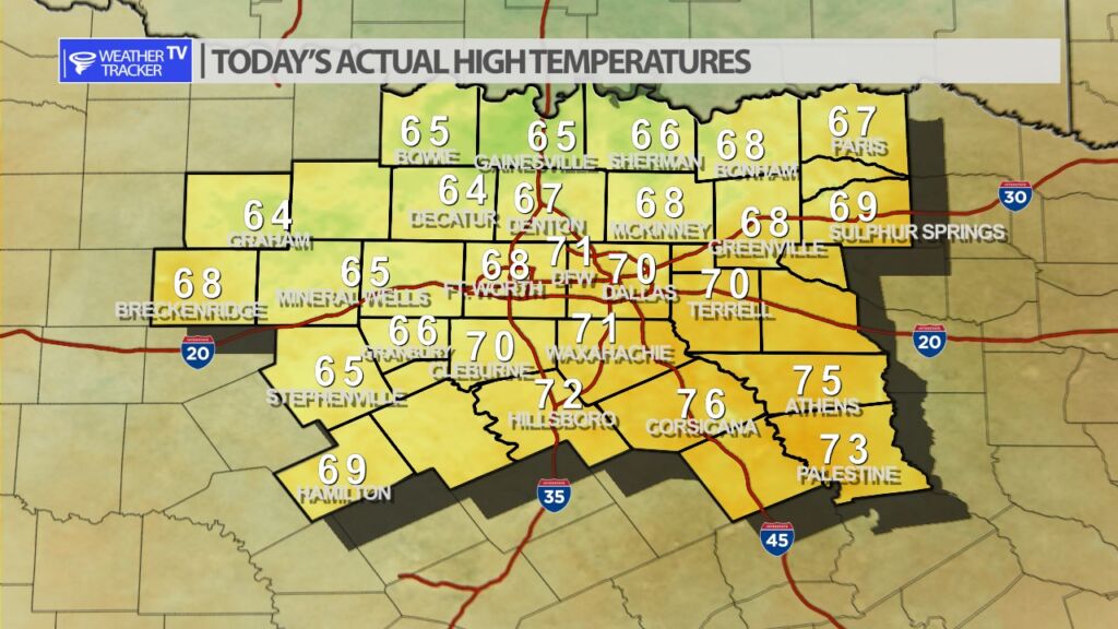 It was a mild and humid afternoon across North Texas with actual highs a mix of 60s and 70s.
