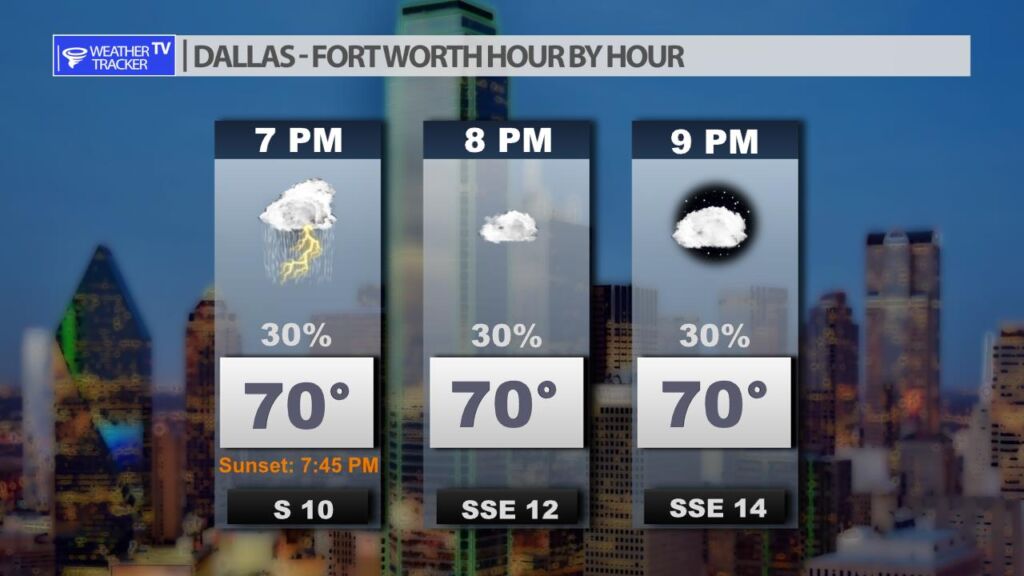 DFW tonight Cloudy. A chance of showers and T-Storms in the evening, then a slight chance of showers and T-Storms after midnight. Breezy and not as cool with lows in the upper 60s. South winds 15 to 20 mph, increasing to 20 to 25 mph after midnight. Wind gusts up to 35 mph are possible. Chance of rain 50 percent. -William