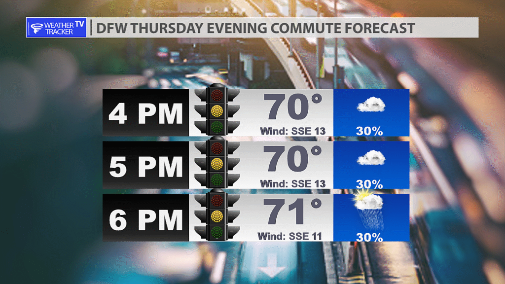 Warm, humid and breezy for your Thursday evening commute in the Metroplex. A few scattered showers or T-Storms are possible.
