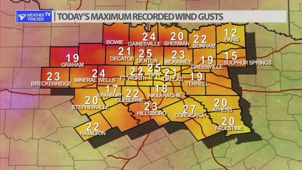 It was a breezy afternoon across North Texas. A south wind will stay up this evening and overnight as well. Peak wind gusts were in excess of 20 MPH for most location this afternoon.