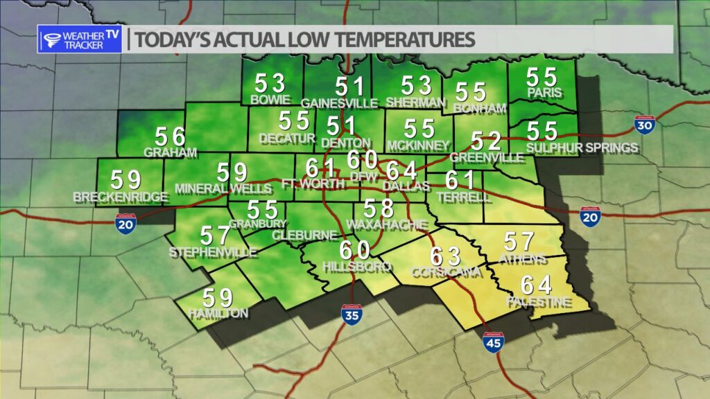 It was a cool but not chilly start to our morning in North Texas with actual lows a mix of 50s and 60s.