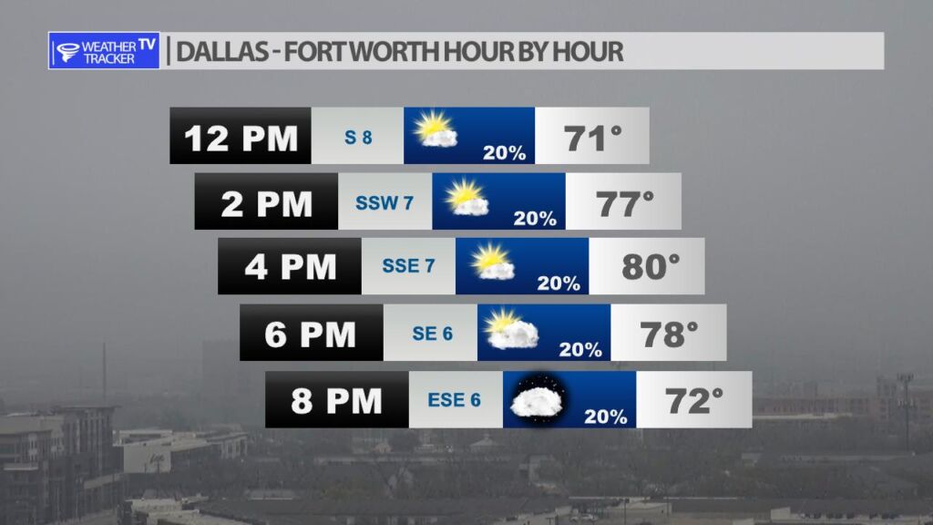 Morning fog will continue to lift and with some sun this afternoon temperatures bounce into the mid to upper 70s in the Metroplex. This afternoon there is a slight 20% chance of a shower or T-Storm.