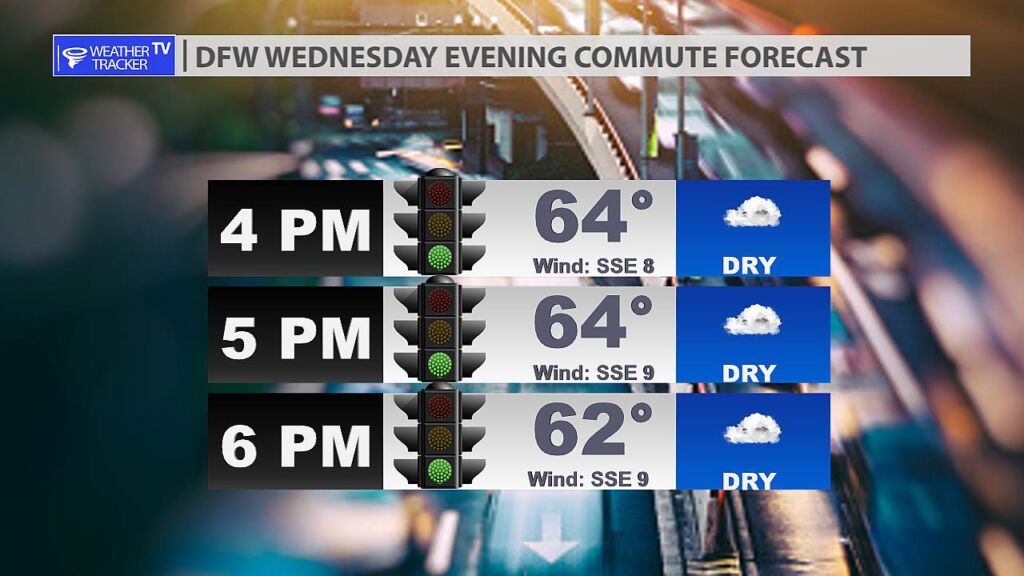 No weather complications for the Wednesday evening commute in the DFW Metroplex. Expect cool and dry conditions with temperatures in the 60s.