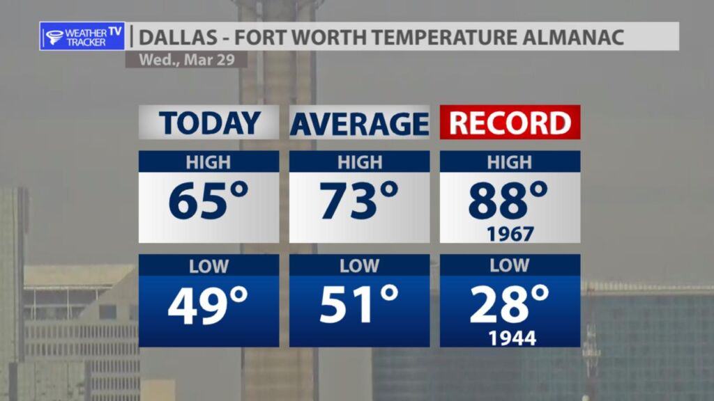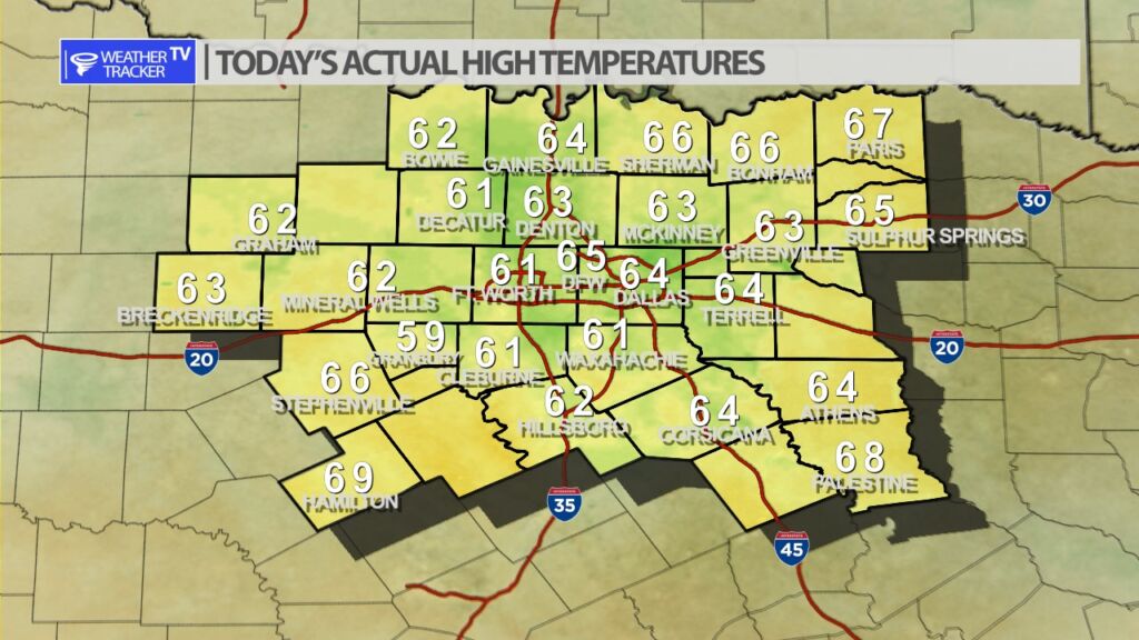 The lingering cloud cover this afternoon worked to hold high temperatures down by a few degrees. Actual highs today were mostly a mix of 60s across North Texas.