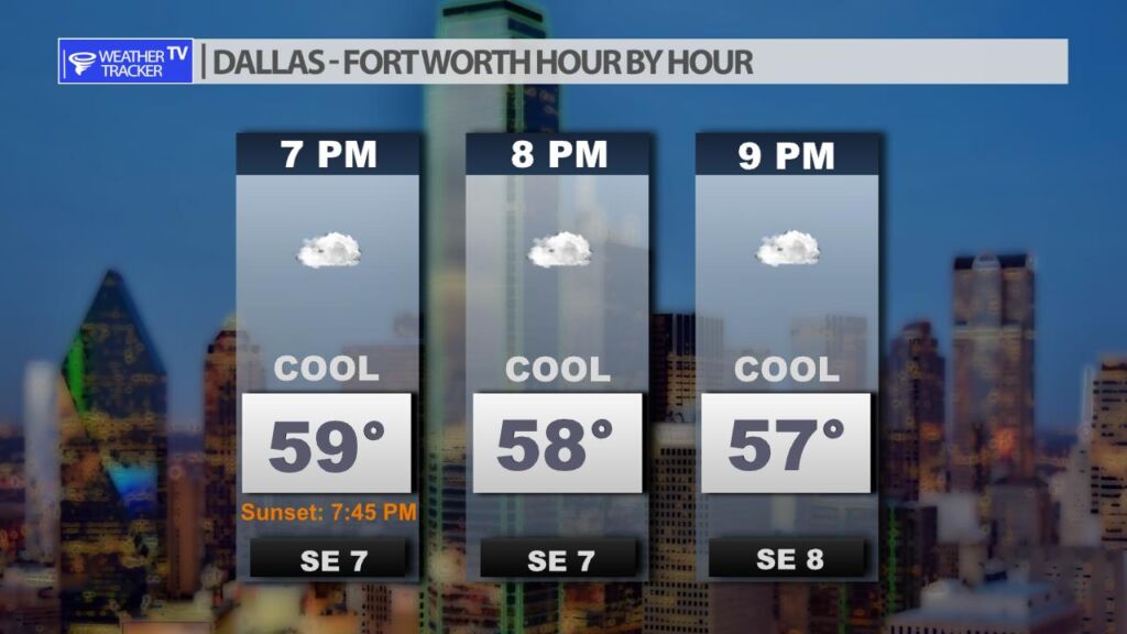 Mostly cloudy and cool this evening in the DFW Metroplex with a south breeze. If you’re making evening plans you may want to grab a warm jacket.