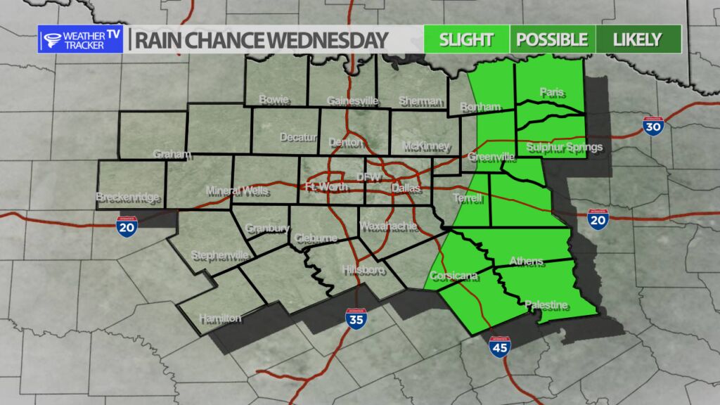 DFW will see off and on rain and storm chances over the next five days. Tomorrow, a few storms are possible late day – any storms that form tomorrow could be severe with a hail threat. Friday, a cold front pushes through the area, and storms will form late morning or early afternoon from either the I-35 corridor, or just to the east. Severe weather with a hail and wind threat would also be possible with any activity Friday. Sunday, a compact storm system moves across the area, and rain and storms may again be possible. It’s still questionable but there could also be a severe threat on Sunday.