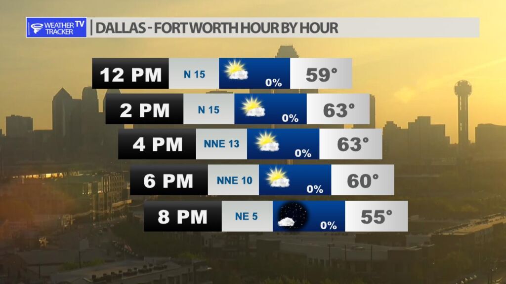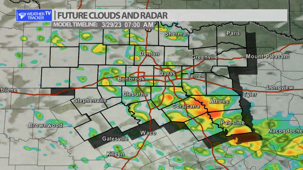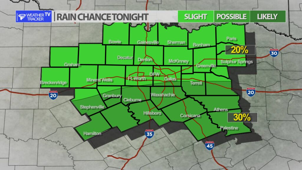 A few showers will be possible tonight across North Texas as a weak disturbance moves through the area. Rainfall will be light and the best opportunity to see rain will be from I-20 to the south. The scattered showers will be drying up by sunrise Wednesday.