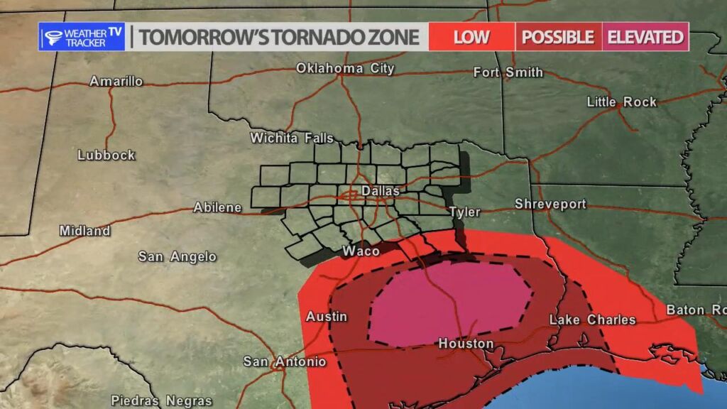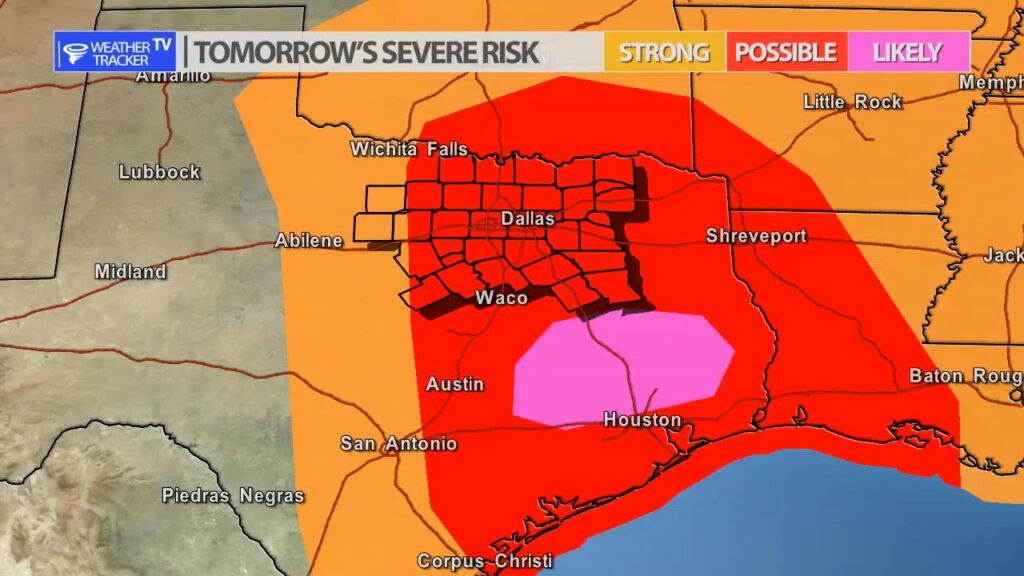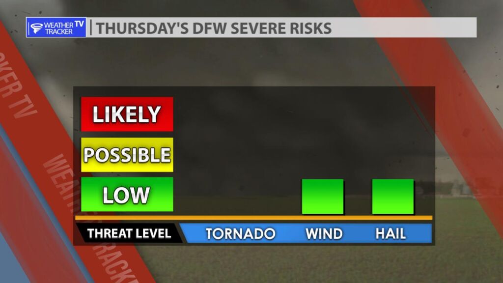The risk of severe weather returns to North Texas tomorrow (Thursday). Scattered showers develop before sunrise. Showers eventually strengthen into thunderstorms during the afternoon. A few of the storms in North Texas could become minimally severe with a quarter sized hail and wind gust to 60 MPH threat. Conditions down I-45 north of Houston will be more favorable for severe weather and even a few tornado warnings. If you’re traveling in that direction tomorrow – heads up.