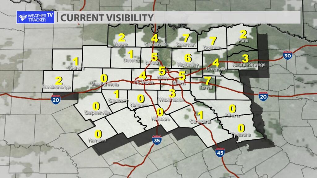 Visibility continues to drop west and south of Dallas – Fort Worth. Areas of patchy to dense fog remain possible. Use caution on the roads this morning.