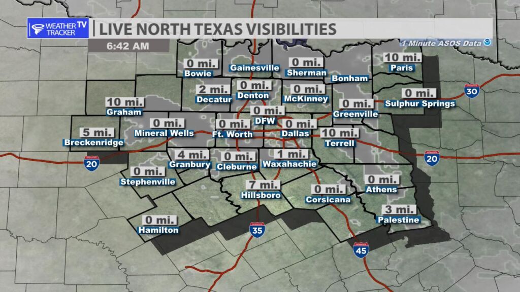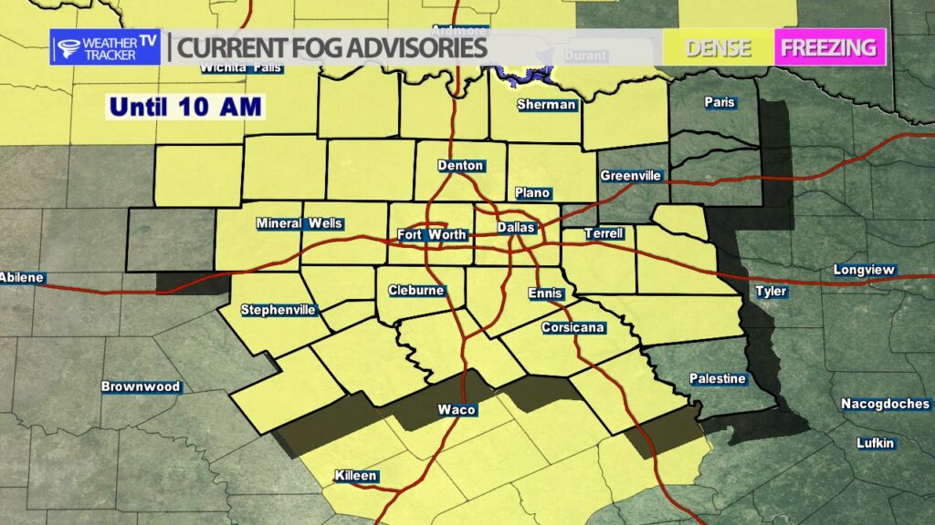 Areas of Dense Fog are possible across North Texas this morning. Use caution if you’re driving on area roadways – visibility could suddenly drop to near zero. The fog will begin to lift by mid morning. A Dense Fog Advisory is in effect until 10 AM.