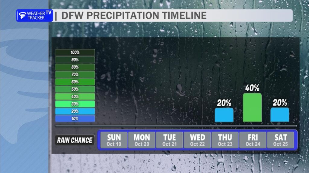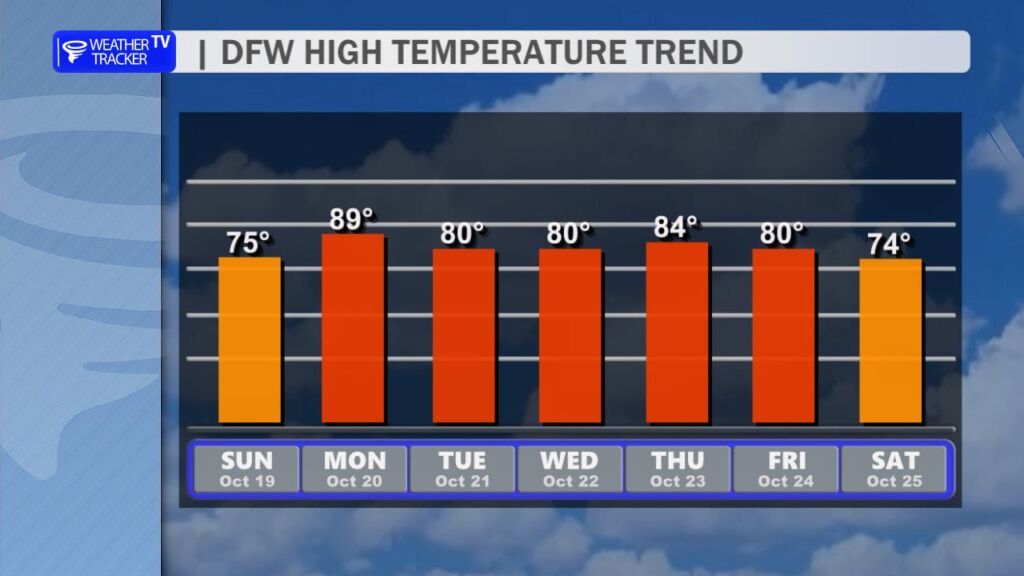 Enjoy today’s fall-like weather with comfortable highs in the 70s and abundant sunshine. On Monday, temperatures will briefly climb back into the 80s and even a few 90s (west) before another fall cold front arrives on Tuesday. Breezy conditions and warmer conditions on Monday will increase grass fire risks, especially west of the I-35 corridor. The Tuesday front will pass through North Texas dry. The next rain and storm chance is showing up this Friday with an additional cold front.