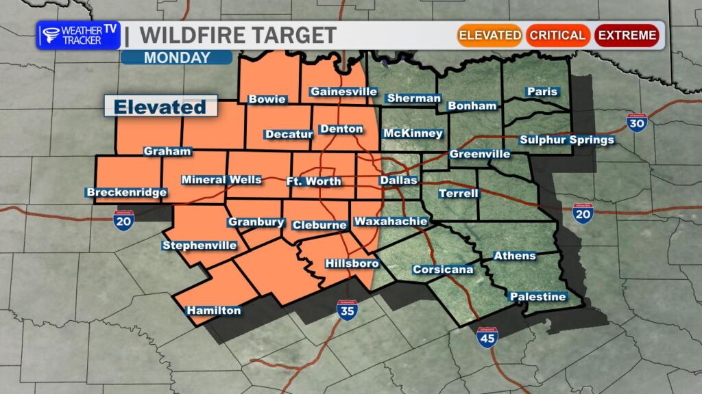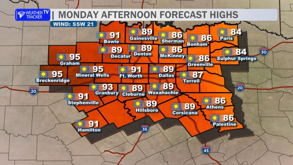 • Monday’s Conditions: Temperatures rise to the 80s and 90s (west), with breezy conditions increasing grass fire risks, especially west of I-35.