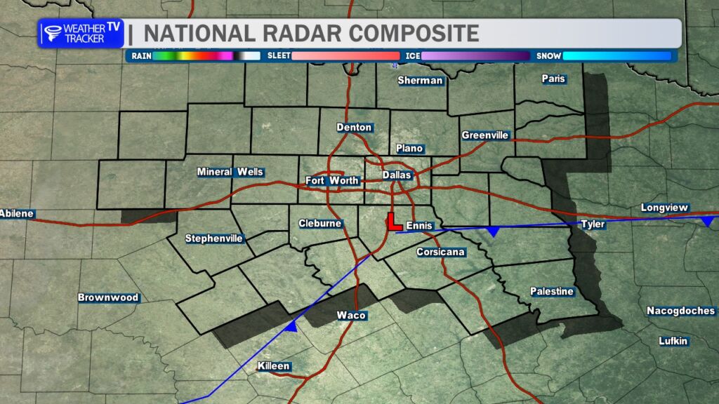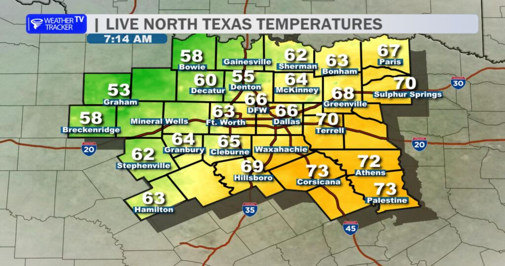 7:15AM- A weak cold front continues to push through North Texas this morning. You can see wide-ranging temps. 58 in Bowie behind the front to 73 ahead of the front in Corsicana.