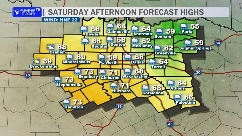 DFW TODAY Cloudy with a chance of showers with a slight chance of T-Storms this morning, then partly sunny with showers likely with a chance of T-Storms this afternoon. Highs in the mid 60s. South winds 10 to 15 mph. Chance of rain 70 percent.