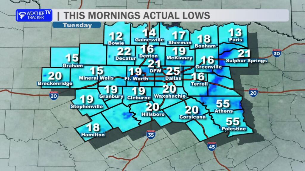 It’s another bitterly cold start across the region. Most communities woke up to temperatures in the teens and 20s, and officially at DFW Airport we dropped to 21 degrees right around sunrise.