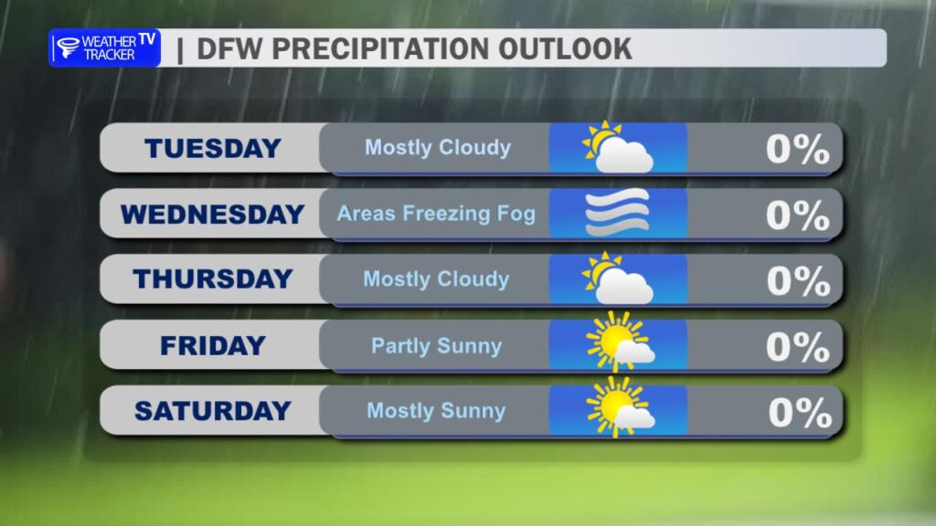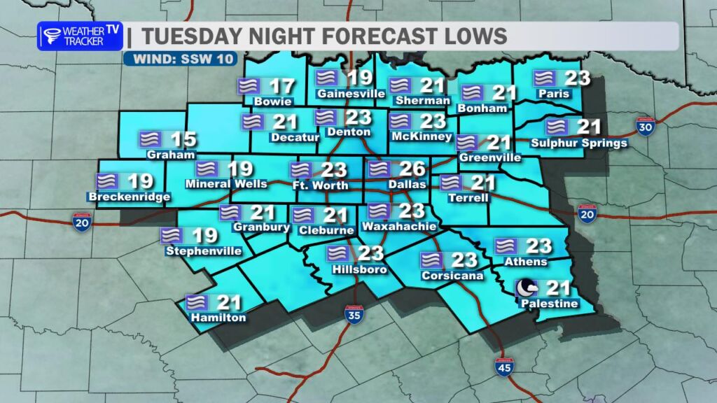 DFW TONIGHT Mostly cloudy. Patchy freezing fog after midnight. Cold with lows in the mid 20s. South winds around 5 mph, becoming west after midnight. -William