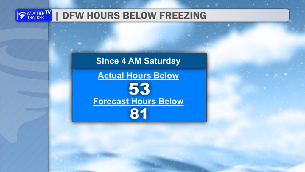 We are still projecting DFW to stay below freezing for 81 consecutive hours. Tomorrow (Tuesday) around 1PM we should get back above freezing.