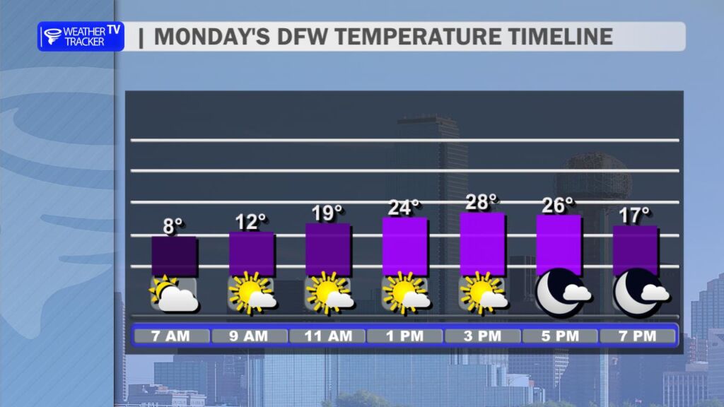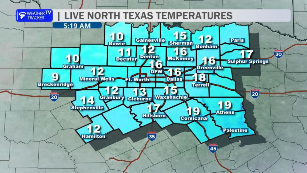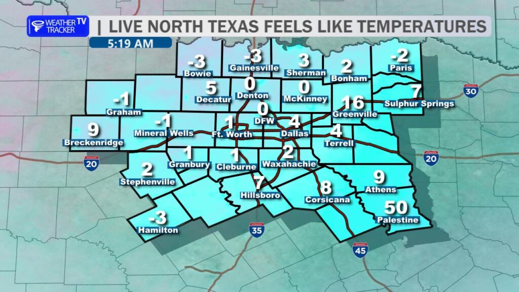 5:15 AM – Good Monday morning. It’s a bitterly cold start, with temperatures in the teens and wind chills near zero across North Texas. Roadways remain slick and hazardous across the Metroplex. Stay home and stay warm if you can.