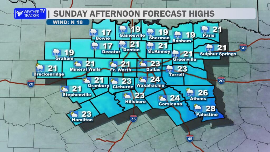 This afternoon, temperatures will essentially flatline in the teens and 20s area-wide. Gusty north winds will keep wind chill values dangerously cold, dropping into the single digits. Roadways across the Metroplex remain sleet-covered and are reported to be slick and hazardous. If possible, stay off the roads. With these temperatures and wind chills, it’s best to stay home and stay safe.