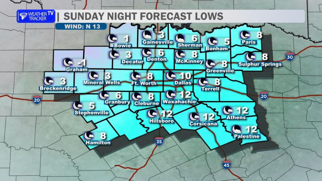 Tonight, we head into record-breaking cold. Low temperatures will fall to near zero northwest of DFW and around 8 to 10 degrees in the Metroplex. The record low at DFW is 12 degrees, and we are expected to break it. Be sure to drip faucets to help prevent pipes from freezing and bursting.