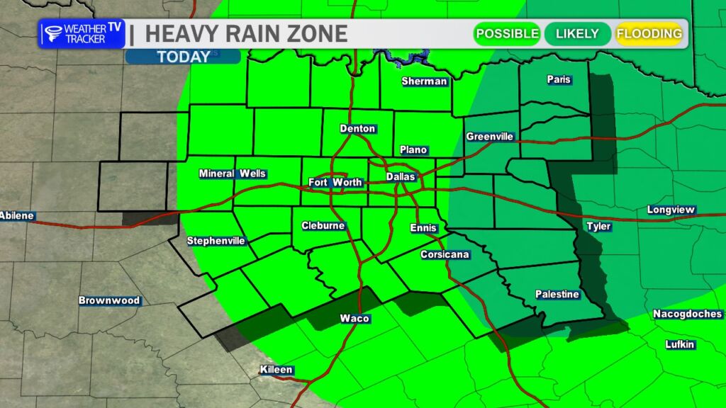 Locally heavy rainfall is possible at times today. While widespread flooding is not expected, you may notice ponding on roadways and minor runoff issues in low-lying or poor-drainage areas. If you encounter water over the road, slow down and allow extra travel time.