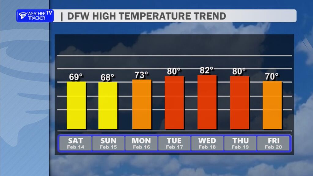 The good news? We dry out on Sunday with improving skies and highs in the 60s. Then get ready for a big rebound next week – temperatures surge back into the upper 70s and lower 80s, bringing an early taste of spring back to North Texas. -William