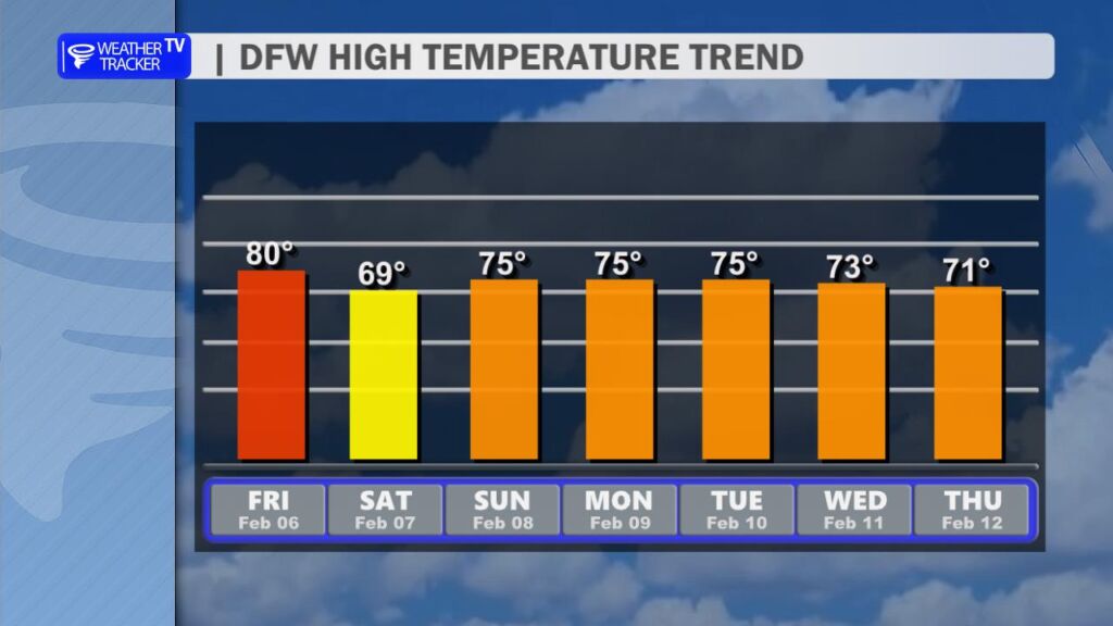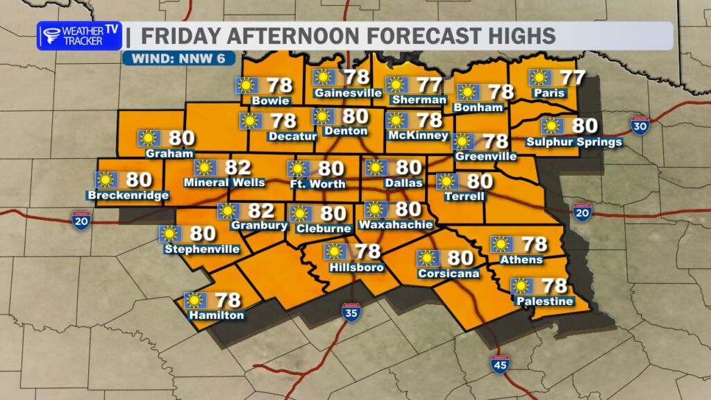 Get ready to soak up a gorgeous end to the workweek. Wall to wall sunshine and those classic deep blue Texas skies will dominate the day. Temperatures will climb quickly this afternoon, with highs soaring into the upper 70s to near 80 degrees across much of the region – easily the warmest day we’ve seen in a while.