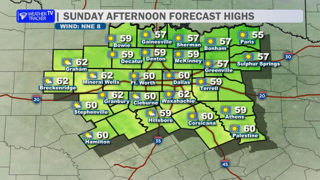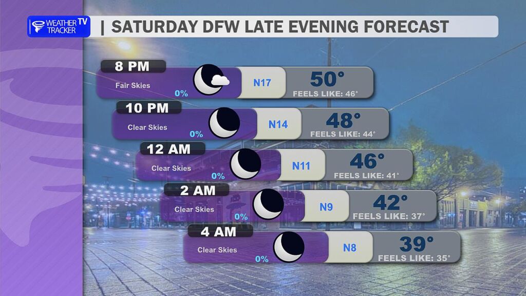 Tonight, skies stay clear but temperatures drop off quickly. Lows will fall into the mid 30s across DFW, with a light north breeze continuing before easing after midnight. If you’re out late or heading out early Sunday, it’ll feel chilly.