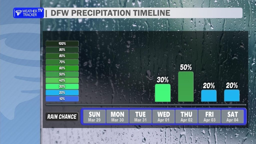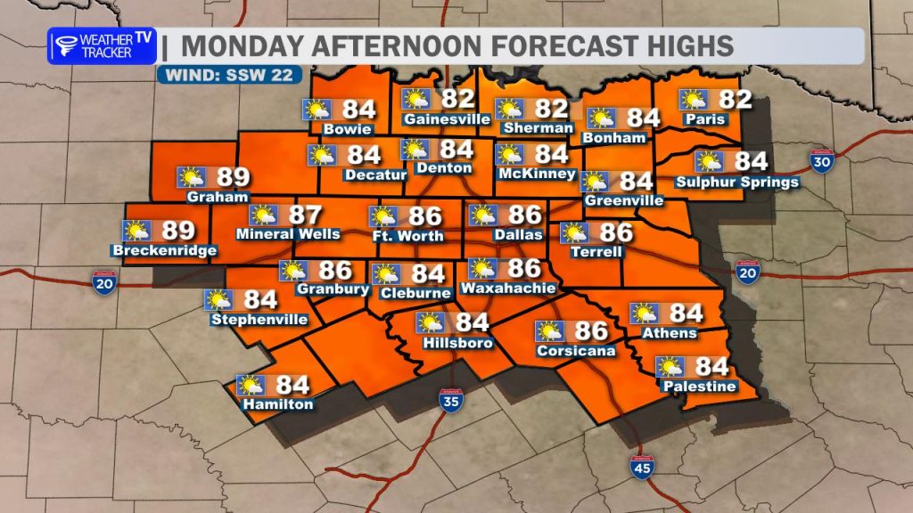 The warming trend doesn’t stop there. As we head into the start of the workweek on Monday, even warmer air moves in. Afternoon highs will push into the mid to upper 80s across much of North Texas, with a few of our western counties flirting with the 90-degree mark. Skies will be partly cloudy, and that gusty south wind will continue to add to the early taste of summer.