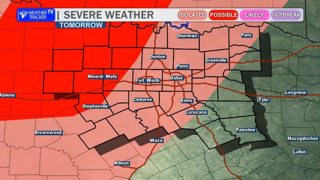 A line of showers and thunderstorms is expected to develop to our northwest and move southeast into North Texas. Some of these storms could become strong to severe, with the primary threats being: