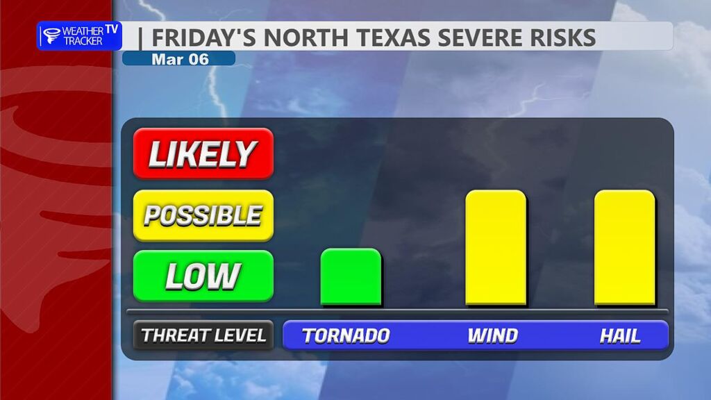 Severe weather is also a concern later this afternoon and tonight. A dryline will begin advancing eastward across North Texas while a strong upper-level storm system approaches from the west. This combination will provide the ingredients necessary for strong to severe thunderstorms. The main threats will be large hail up to the size of golf balls and damaging wind gusts over 65 mph. While the tornado risk remains relatively low, it is not zero, and a tornado warning or two cannot be ruled out.