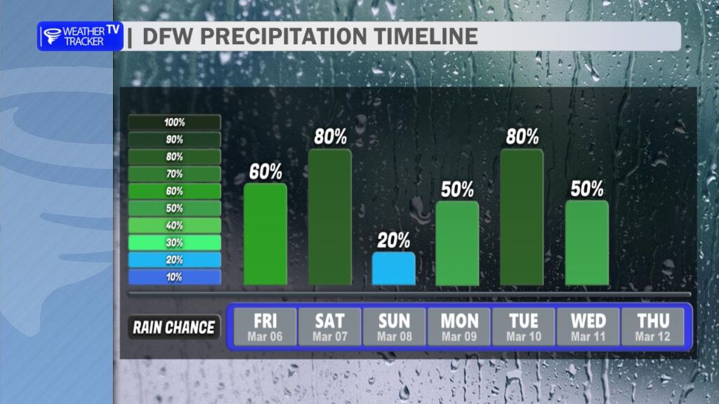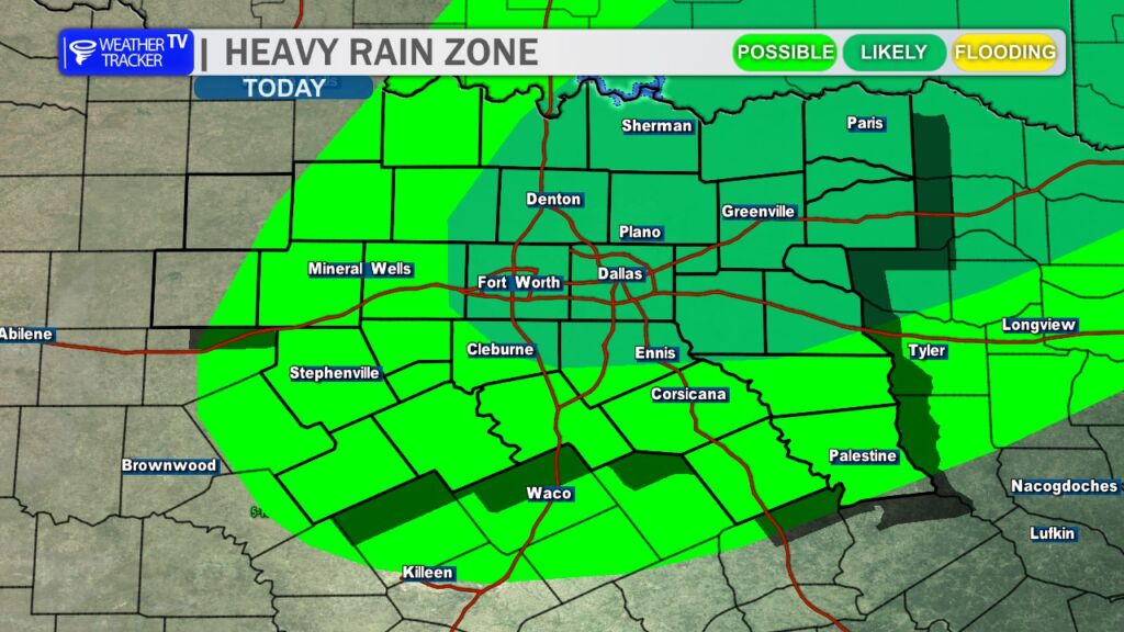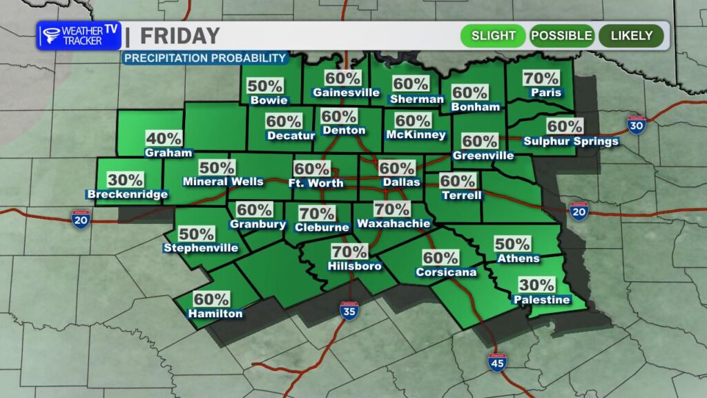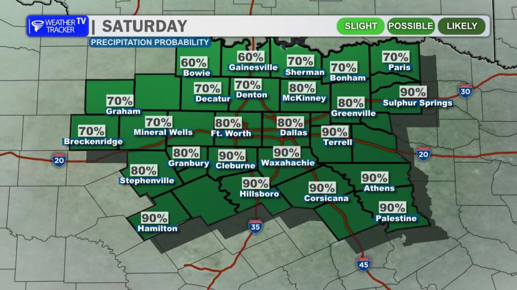 Rain and storm chances continue into Saturday, and periods of heavy rain remain possible. Much of the day could end up being a washout for parts of North Texas, especially if storms repeatedly move over the same areas. Severe weather may also redevelop, particularly south of the I-20 corridor, where hail and strong winds would again be the primary concerns.